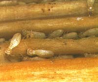 これまでは、防蟻剤を床下に撒いたり、木部に塗布してシロアリの侵入を防ぐバリアー工法が主体でした。これは少しでも処理膜が壊れると効果が薄れ、大量の薬剤を用いる点も問題でした。またシロアリがトンネルを掘らないように、床下に細かい砕石を厚く敷く、コンクリートで覆うなどの方法もありますが、これらは新築時にしかできず、効果も確実とはいえません。最近は、職蟻が採餌活動をして巣の仲間に給餌する習性を利用した駆除方法が、開発されました。これは、職蟻が薬剤を持ち帰りコロニー(シロアリの巣)自体を壊滅させるものです。バリアー工法と較べると薬剤の使用量が非常に少量。セントリコン*・システムがそれで、効果の確実性や安全性などにより米国をはじめ世界中で利用者が増えています。